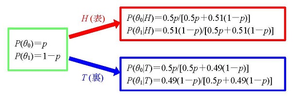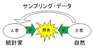 しかし、これだけでは心許ないときには、A君はB君についての情報収集を行なう。一番いいのは、実際に勝負に入る前に何回か試しジャンケン(これを試行または実験という)をしてみて、A君の手の出し方の頻度を見るのである。これは統計学でデータを取ることあるいはサンプリングすることと同じである。ただし、統計的状況では、試しジャンケンによってB君の出す手がA君の出す手に影響されてしまっては困る。そこで、B君は泰然として統計家A君のスパイ行為を黙認する懐の深い自然だと考えるのである。こうして、統計的状況は、統計家対自然という2人ゼロ和ゲームとして定式化され、ここに統計的決定理論が誕生する。その際のデータの利用に際してはベイズの定理が活躍することになる。