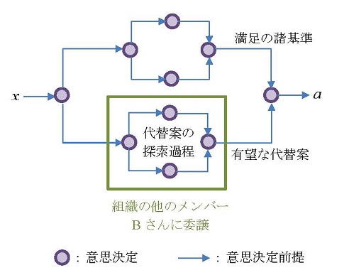 ところがA君は、B君のごく親しい友人のC君から耳よりな情報を入手した。B君はかつてC君に「僕はパーしか出さないことに決めているんだ」と話していたというのである。そこでC君は自分がB君とジャンケンをするわけにはいかないので、A君にこの情報を提供し、もうけた分は2人で山分けにしようと持ちかけたわけである。いわばB君についての権威であるC君からの情報なので、A君はそれを受け入れ(つまり権威あるものとして信用し)、この情報を前提として、意思決定を行なうことにしたのであった。つまり、「チョキを出す」ことにしたのである。(ただし、実際の経済活動では、こうした取引はインサイダー取引と呼ばれ、禁じ手にされているはずであるが……。) そしてA君(というより組織)はB君に対して確実に勝利することになったのである。たった2人の連携プレイとはいえ、これは組織の勝利であった。限定された合理性しかもたない人間が、組織的な意思決定過程の中でそれをある程度克服したささやかな事例である。ここに近代組織論が誕生することになる。