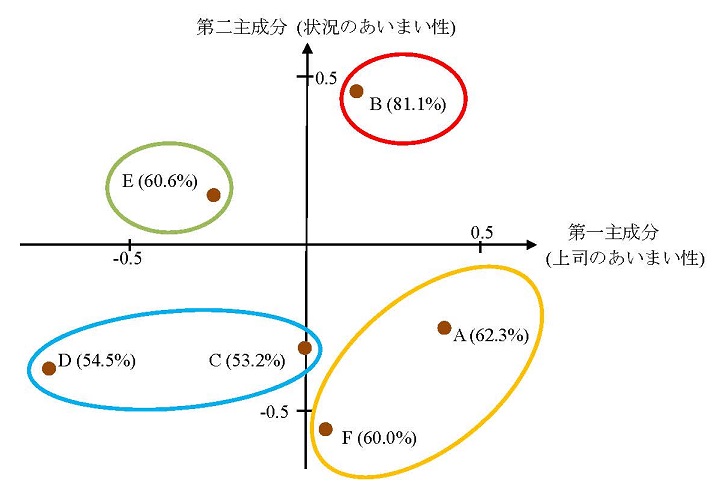 そこで、各社ごとに第一主成分、第二主成分の平均得点を求めて、それをもとに各社をプロットしてみると、図7.1が得られる。これによると、やり過ごし比率が81.1%と最も高かったB社は、「上司のあいまい性」、「状況のあいまい性」ともに高かったのに対して、やり過ごし比率が60%台の3社については、A社、F社は「上司のあいまい性」が高く、E社は「状況のあいまい性」が高いというように、ややタイプの異なっていることがわかった。