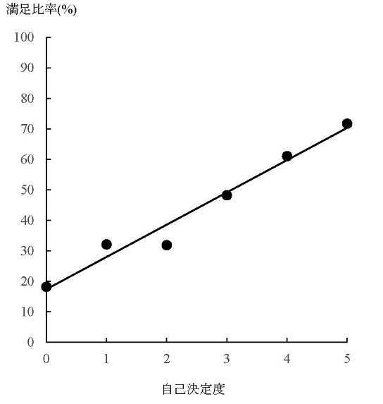 この質問Q8.1でYesつまり満足感を感じると答えた人の比率を満足比率と呼ぶことにすると、表8.2、図8.2のように、自己決定度が上がるにつれて、満足比率もまた上昇するというようなきれいな直線的関係が得られる。図8.2の直線は回帰分析で求めたもので、その結果は表8.3に示されている。これによると、自己決定度3で満足比率はほぼ50%になり、自己決定度が1上がるごとに満足比率が約10%上昇する関係のあることがわかる。