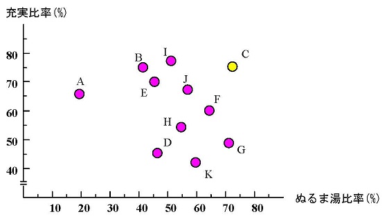 しかも、会社別に、ぬるま湯感を感じている比率と、仕事の充実感を感じている比率を求め、会社をプロットしてみると、図1.1が得られ、この両者の間には、全体的にはやはり負の相関関係があるものの、C社については、こうした傾向からはずれる特性を示していることがわかった。このC社は、71.7%がぬるま湯だと感じていて、その比率は11社中もっとも高くなっているが、一方、仕事に充実感を感じている者も72.9%もいて、この比率も11社中3番目に高い会社なのである。つまり、C社においては、まさに仕事の充実感とぬるま湯感が共存していることになる。