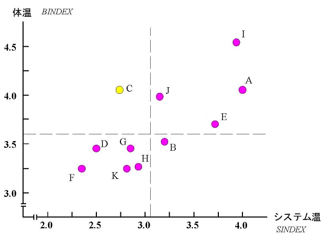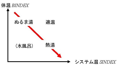 ここで「体温」とは、組織のメンバーの組織人としての変化性向であり、組織のメンバーが現状を打破して、変化をもたらそうとする意欲がどの程度あるのかを表す指数と考えられる。一方、「システム温」とは、既に定義したように、組織のシステムとしての変化性向であり、組織のシステムがメンバーの変化を受け止め、あるいは促す仕組み、制度にどの程度なっているのかを表す指数であった。そこで、組織人としての変化性向として BINDEX を定義し、これを体温(body temperature)と呼び、この体温とシステム温との温度差で、ぬるま湯感を説明することを考えよう。つまり、思いきって単純化をして、体感温度を