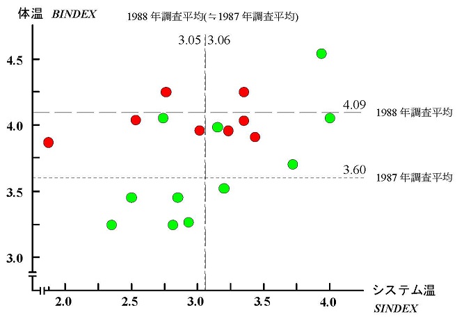 図1.3 体温・システム温散布図(1987年調査)