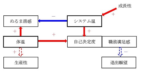 体温を先行変数として、自己決定度と生産性との間で疑似相関があると考えられる。しかし、自己決定度に対しては、システム温も影響を与えることから、その生産性との疑似相関はより弱いものになってしまうし、問題の職務満足と生産性との相関関係はさらに弱まり、明確な相関関係が見られなくなっていることも十分に考えられる。そして、こうした図式の中でシステム温がうまく機能しているかどうかということが、実は、本書のメイン・テーマであるぬるま湯感によって検知されていたのである。